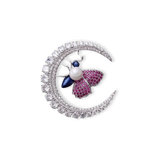 Brooch in 18k gold plated brass hardware, set in diamond simulant, freshwater pearl, as well as a blue, and pink crystal.