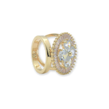 Meticulously crafted in tarnish-resistant 18K gold or platinum-plated copper, this double-band ring features an oval halo of precision-cut diamond simulants.